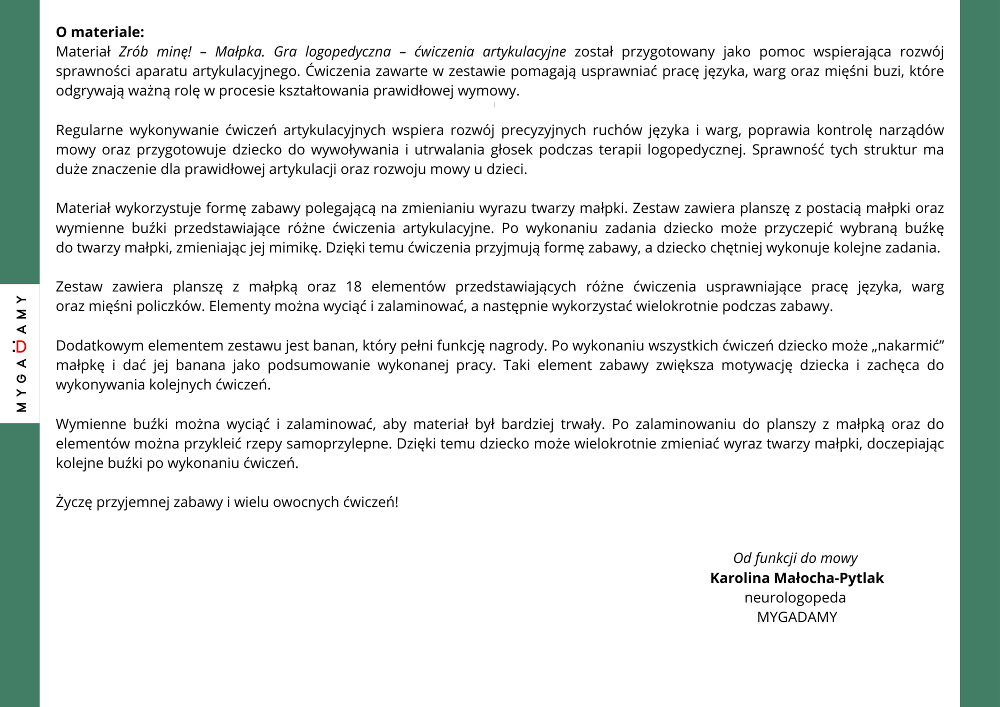 Zestaw wykorzystuje formę zabawy z wymiennymi buźkami małpki. Po wykonaniu ćwiczenia dziecko może zmienić wyraz twarzy małpki, doczepiając kolejną buźkę. Elementy można wyciąć, zalaminować i przymocować za pomocą rzepów samoprzylepnych, dzięki czemu materiał można wykorzystywać wielokrotnie. Po wykonaniu wszystkich ćwiczeń dziecko może „nakarmić” małpkę bananem jako nagrodą za wykonaną pracę.