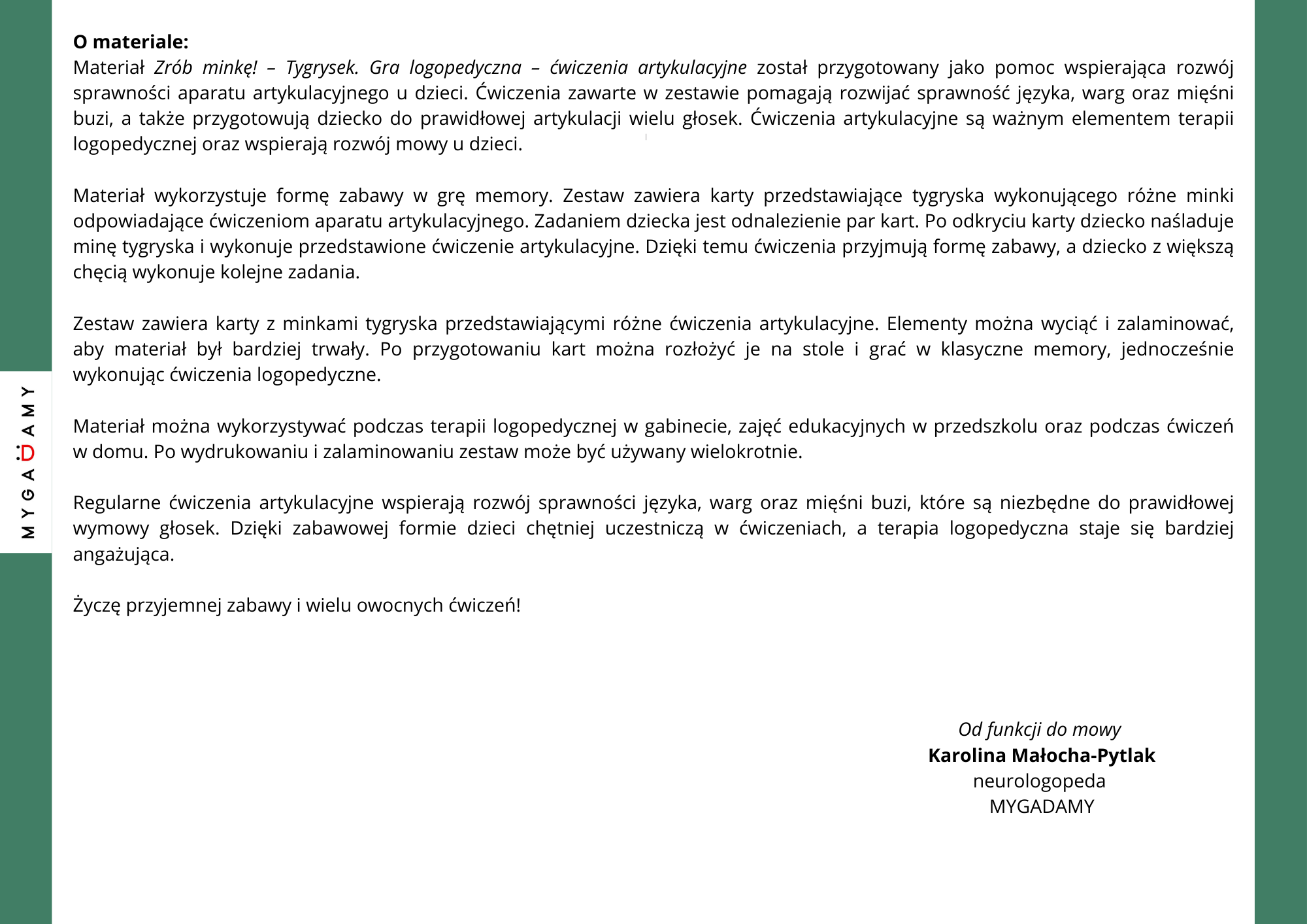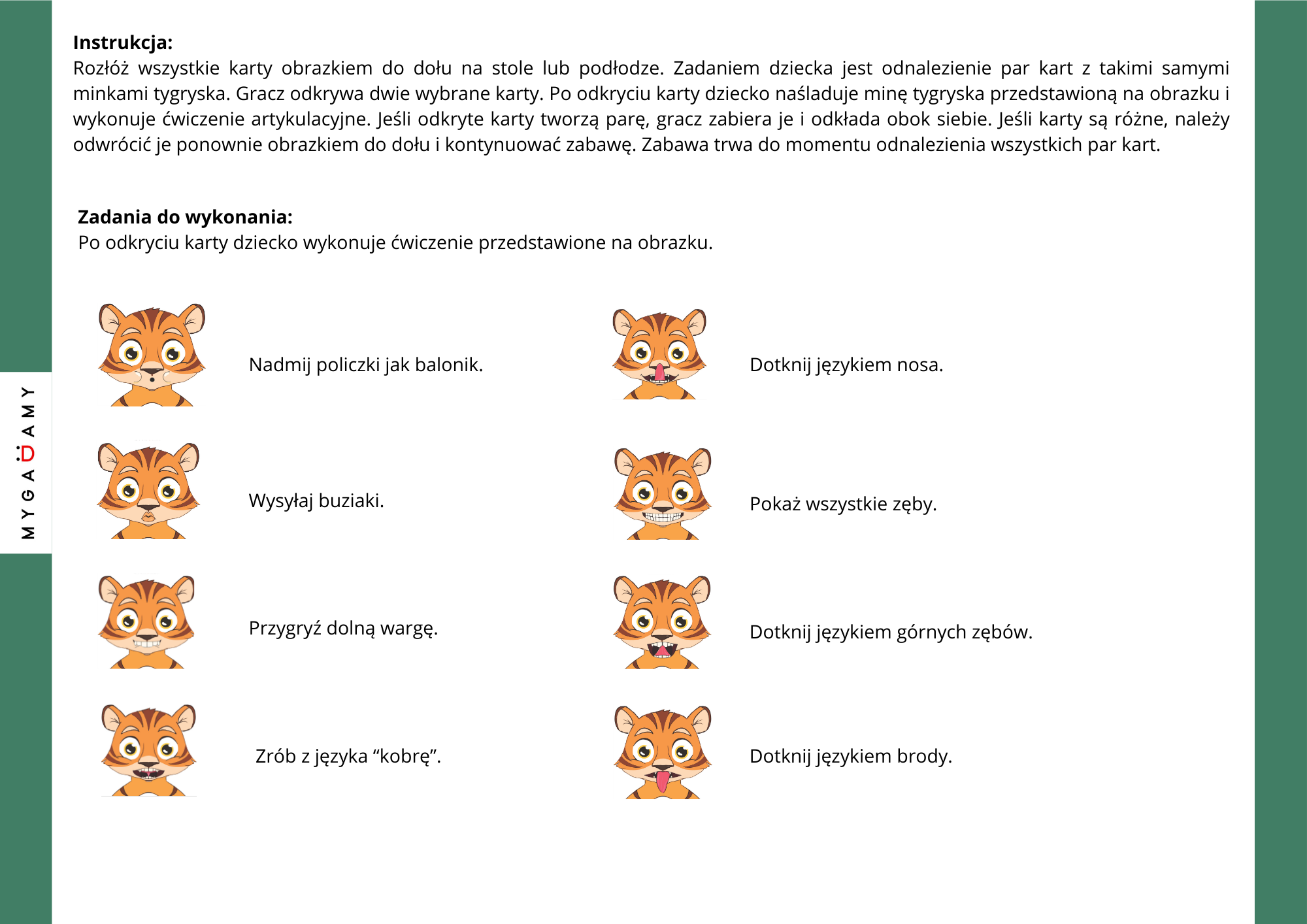Materiał wykorzystuje formę zabawy w grę memory. Zestaw zawiera karty przedstawiające tygryska wykonującego różne minki odpowiadające ćwiczeniom aparatu artykulacyjnego. Zadaniem dziecka jest odnalezienie par kart. Po odkryciu karty dziecko naśladuje minę tygryska i wykonuje przedstawione ćwiczenie artykulacyjne. Dzięki temu ćwiczenia przyjmują formę zabawy, a dziecko z większą chęcią wykonuje kolejne zadania.