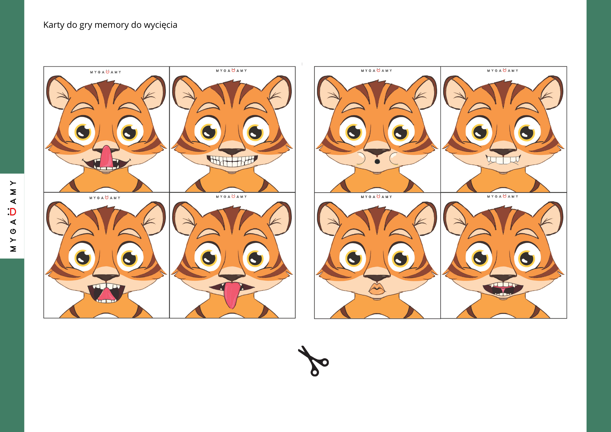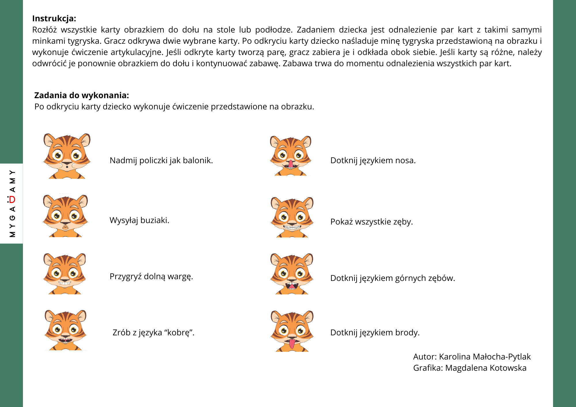 Zestaw zawiera karty z minkami tygryska przedstawiającymi różne ćwiczenia artykulacyjne. Elementy można wyciąć i zalaminować, aby materiał był bardziej trwały. Po przygotowaniu kart można rozłożyć je na stole i grać w klasyczne memory, jednocześnie wykonując ćwiczenia logopedyczne.