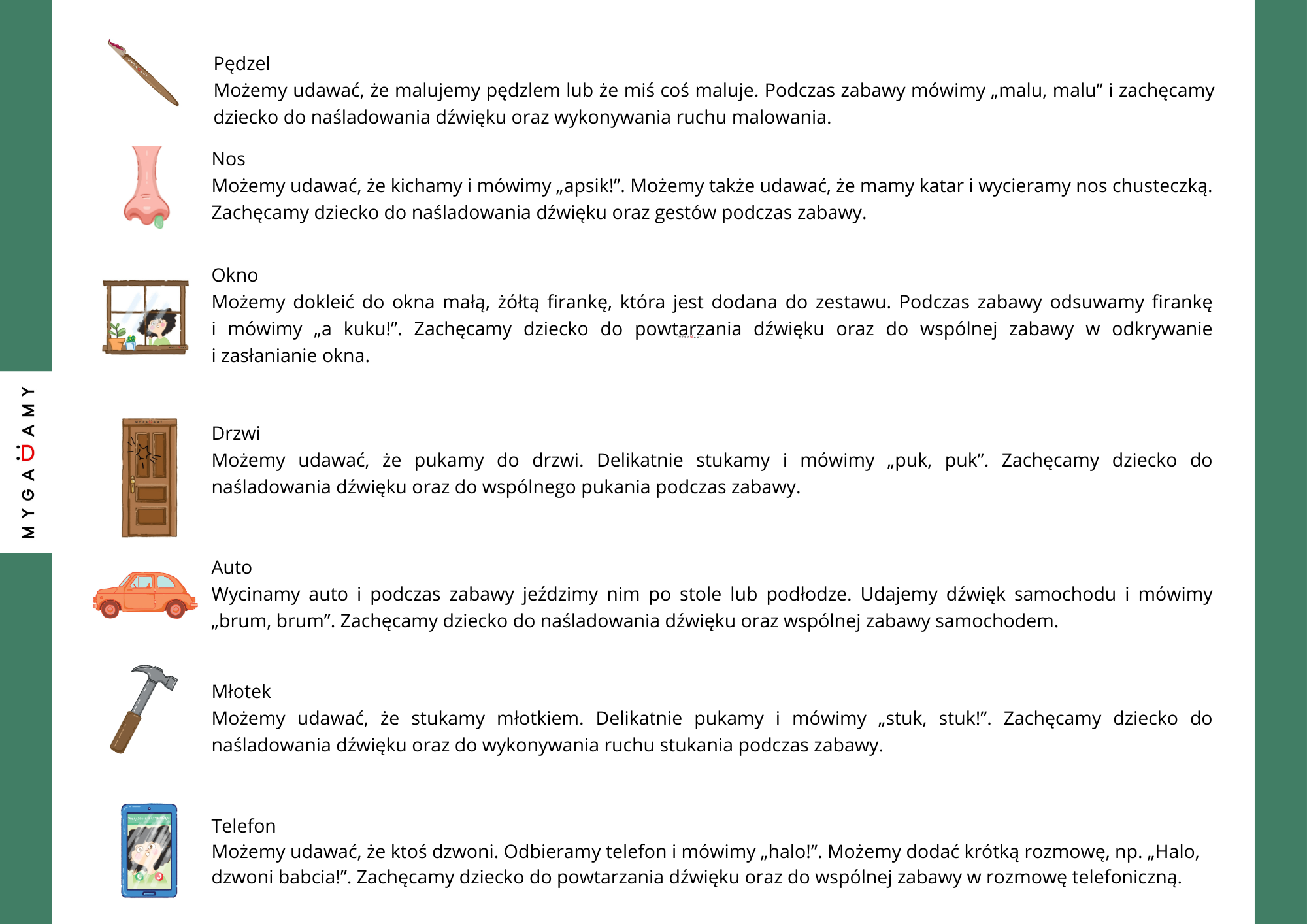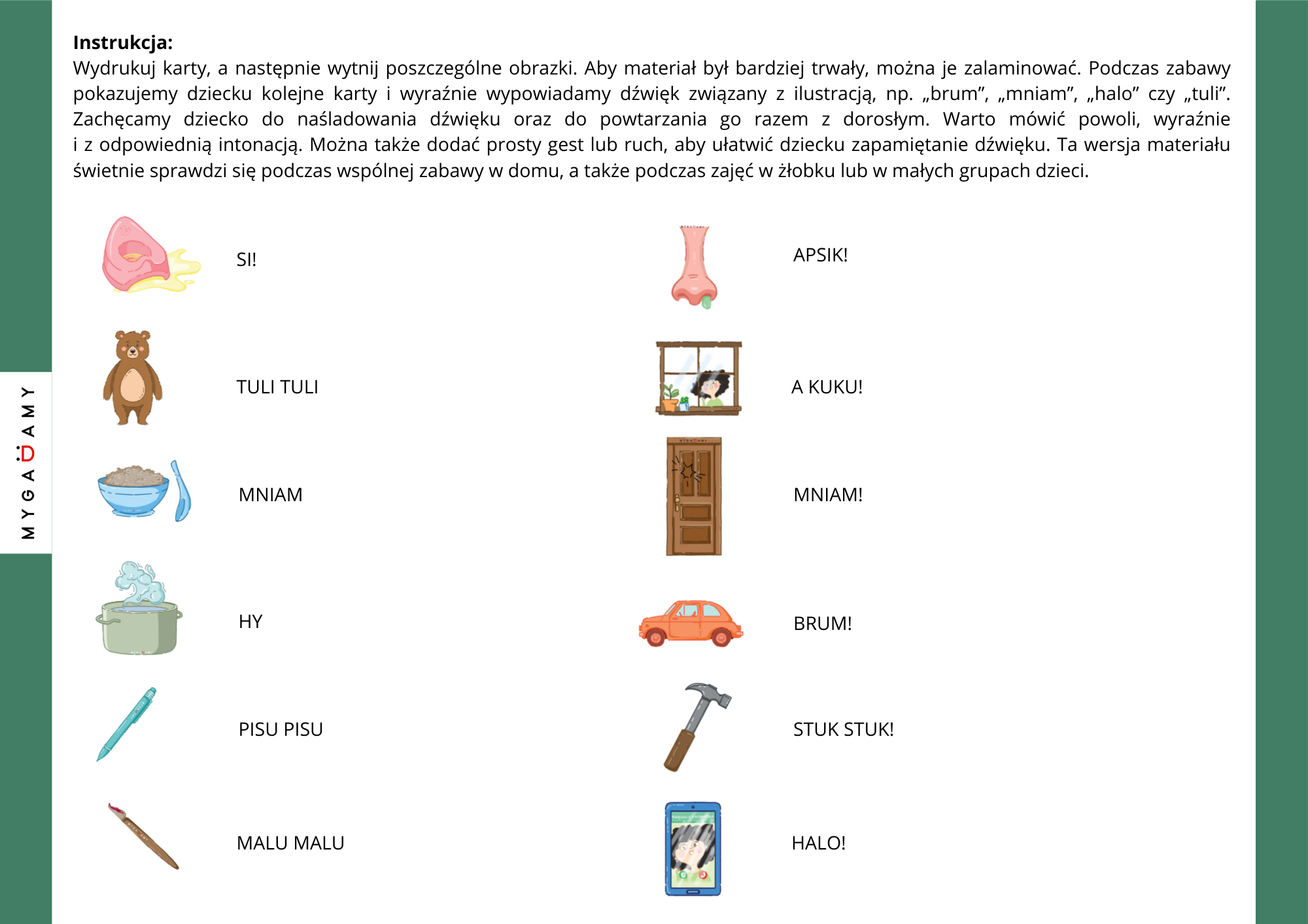 Materiał zawiera dwie wersje pracy z ilustracjami. Pierwsza wersja to karty, które można wyciąć i wykorzystywać do pokazywania dziecku obrazków oraz naśladowania dźwięków. Druga wersja zawiera większe elementy, które można wyciąć i wykorzystać jako rekwizyty podczas zabawy. Dzięki temu można wykonywać proste działania, np. przytulać misia i mówić „tuli, tuli”, jechać samochodem i powiedzieć „brum, brum” lub udawać rozmowę przez telefon i powiedzieć „halo”.