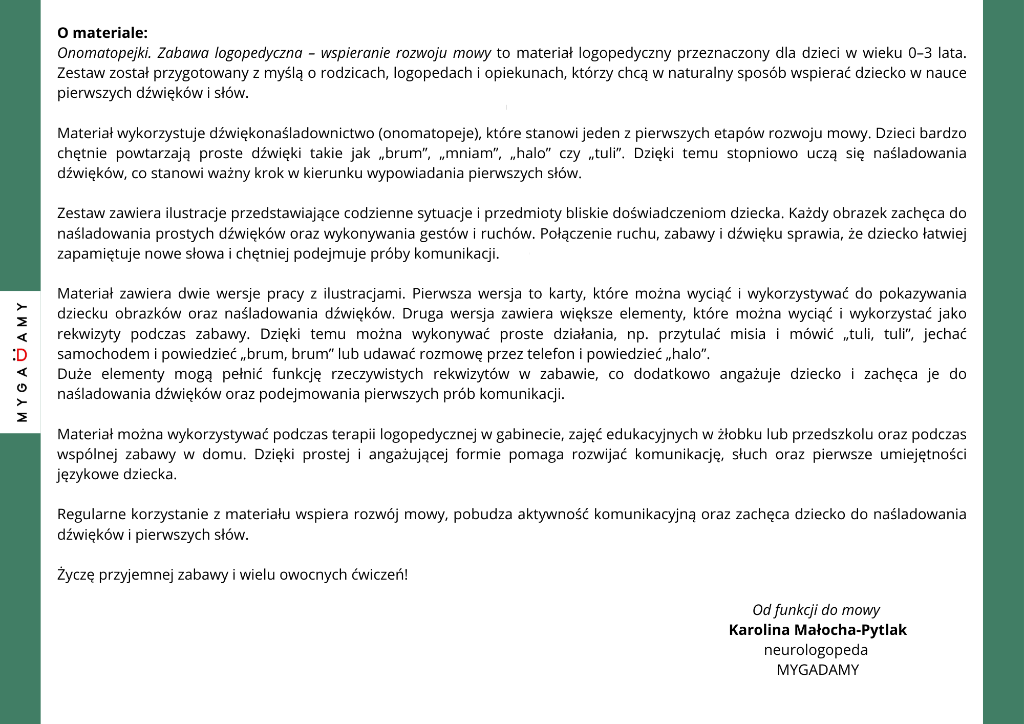Materiał został przygotowany tak, aby w naturalny sposób wspierać rozwój mowy u najmłodszych dzieci. Zabawa z wykorzystaniem onomatopei pomaga dziecku poznawać pierwsze dźwięki, które są ważnym etapem w nauce mówienia. Proste wyrazy dźwiękonaśladowcze są dla dzieci łatwiejsze do powtarzania niż dłuższe słowa, dlatego często pojawiają się jako jedne z pierwszych elementów rozwijającej się mowy.